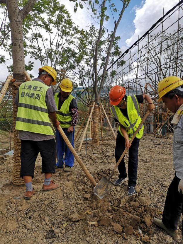 周凌鹏检查并指导工人做水圈围堰及松土工作 因此次进博会项目正值高温炎热天气,对苗木的存活以及复壮存在着巨大考验,对此,他实施了严格的管理,每天都在工地上一遍遍的检查,对各个步骤严格把控,对不符合要求的立即亲自指导工人返工重做,并且坚持每日一次工程例会,各区域负责人及时提出问题沟通交流,他坚信只有大家协调合作才能发挥团队最大的作用。